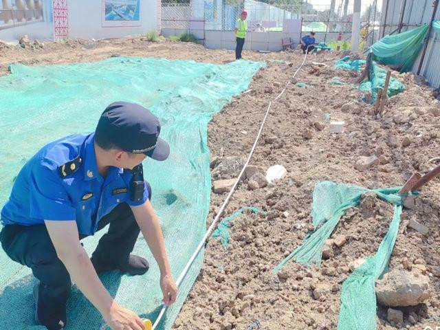 经执法人员现场勘验,施工工地未采取有效覆盖措施的沙土,东西方向长2.5米,南北方向长15.8米,占地面积为39.5平方米。经核对,该施工单位一年内初次发生此类性质行为。执法人员指出,源头管控是扬尘治理的第一防线,一定要做好防尘苫盖工作,随即要求施工方立即落实整改,将裸露土方苫盖完毕,并当场开出谈话通知书,要求相关负责人配合接受进一步的调查处理。